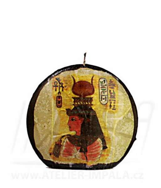Sada originálních svíček ze série Svíčky Egypt s motivem hlavy egyptské bohyně Hathor. Ručně vyráběné parafinové svíčky v několika zajímavých tvarech, máčené ve žluté polevě a dozdobené máčením v polevě černé.